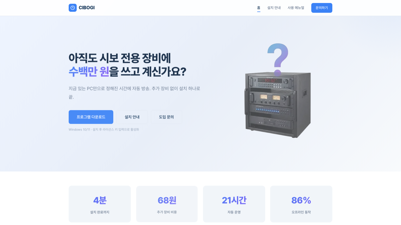 시보기 프로그램 판매를 위한 브랜드 홈페이지와 Windows 기반 자동 차임·음원·TTS 송출 프로그램을 함께 구축한 프로젝트입니다. 웹에서는 제품 소개와 도입 문의를 제공하고, 데스크톱 앱에서는 시간표 기반 자동 방송과 배경음악 제어 기능을 지원합니다.